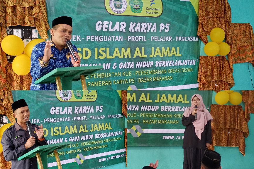 Sementara itu, sesaat sebelum membuka resmi Gelar Karya P5 SD Islam Al Jamal, Pengawas Bina SD pada Dinas Pendidikan Kota Tasikmalaya, H. Koswara, S.Pd., M.Pd diawal kata sambutannya menyampaikan apresiasi dan penghargaan setinggi-tingginya kepada segenap civitas akademika SD Islam Al Jamal, juga peranserta masyarakat dalam hal ini para orang tua siswa yang telah berkontribusi sehingga anak-anak mampu merefleksikan program Merdeka Belajar dengan Kurikulum Merdeka yang sasarannya adalah pembentukan karakter bangsa melalui P5 (Proyek Penguatan Profile Pelajar Pancasila).